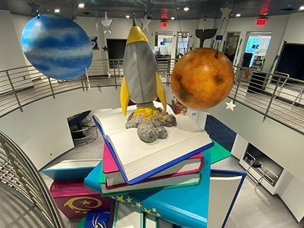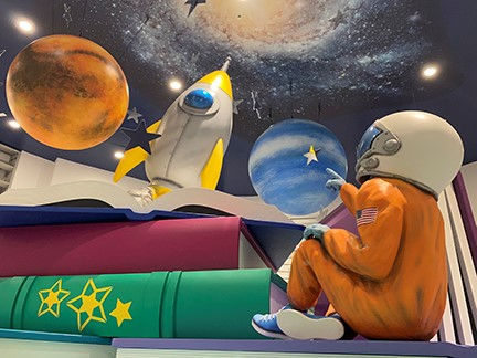 Books are configured in such a way to create four distinct reading areas around the structure. Each book is unique with a rocket ship bursting out of the very top one. Above the mountain are hanging planets and stars with a child dressed in an oversized astronaut's suite excitedly pointing upwards.
