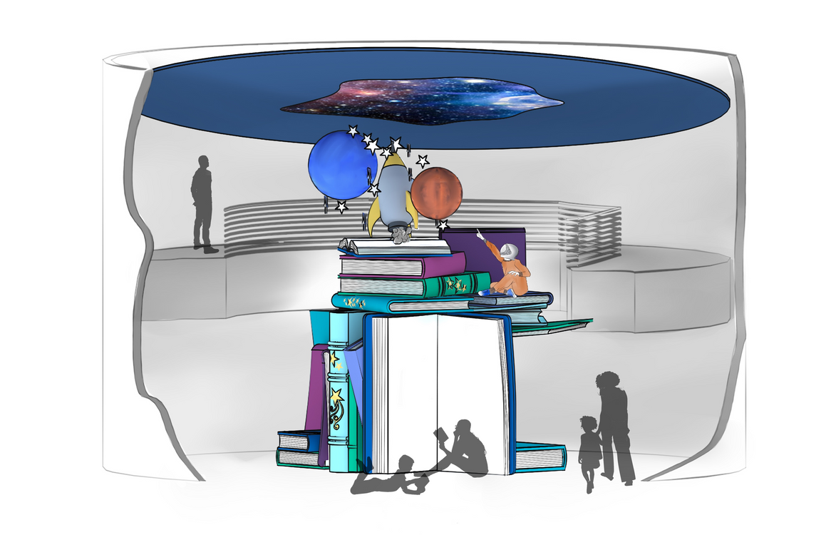 This library plainly asked for a for a mountain of giant books leading into outer space. What they received is an interactive stack of whimsical books for children to see and dream of.