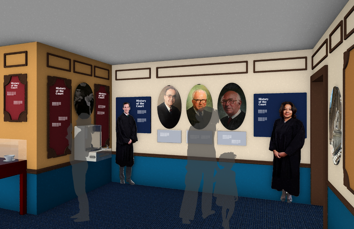 In the middle of the room, there is a "Road to becoming a judge" interactive where visitors literally walk a path to becoming either a state or a federal judge. Through this, they can see what life and educational choices impact their journey.